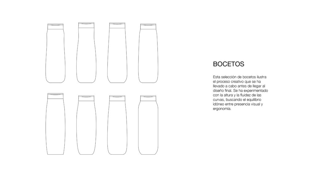 Esta propuesta de botella presenta una silueta contundente y a la vez amable. Evita las aristas duras, apostando por curvas suaves y una transición fluida hacia el tapón, lo que aporta una sutileza y elegancia poco común en formatos de botellas de gran capacidad. En cuanto a los colores, se ha optado por una paleta en tonos pastel y un acabado translúcido que evoca naturalidad y frescura