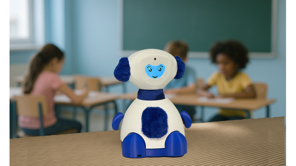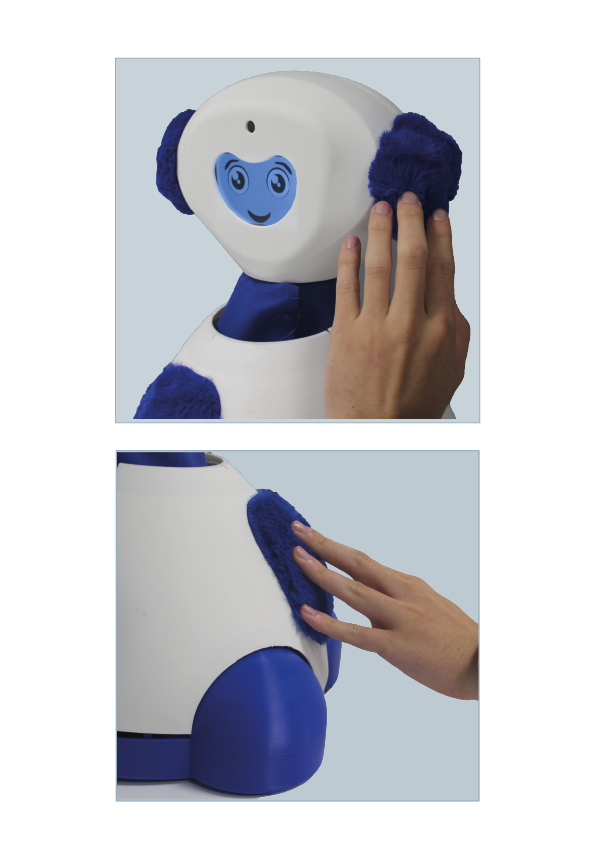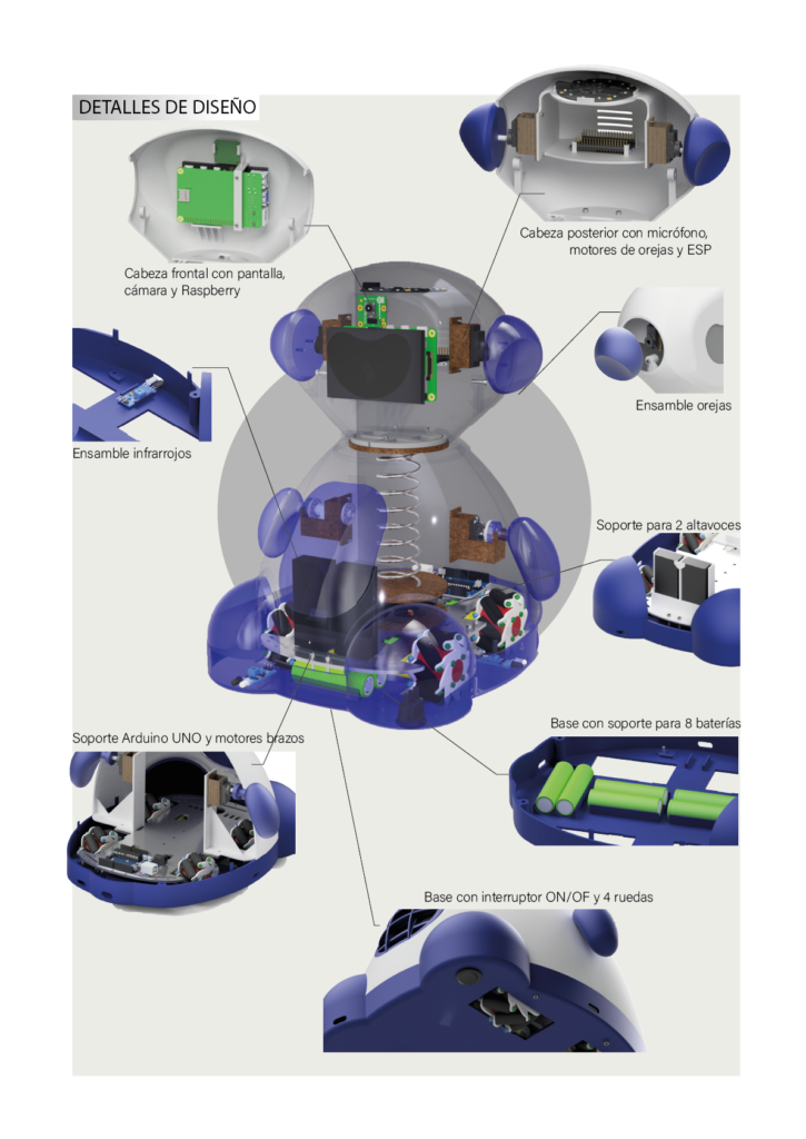 El robot está concebido como una plataforma interactiva capaz de desplazarse horizontalmente y comunicarse con los niños a través de múltiples estímulos. Incorpora sensores, cámara, micrófono, altavoces y una pantalla situada en la cabeza donde se representan emociones como alegría, tristeza, asombro o enfado. La forma del robot y sus extremidades recubiertas de tela azul refuerzan una apariencia amable y cercana, pensada para generar confianza en el usuario infantil.