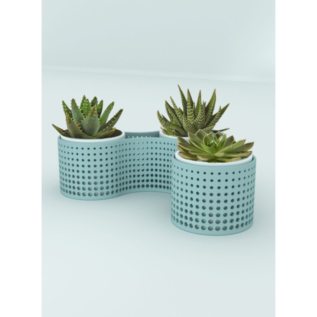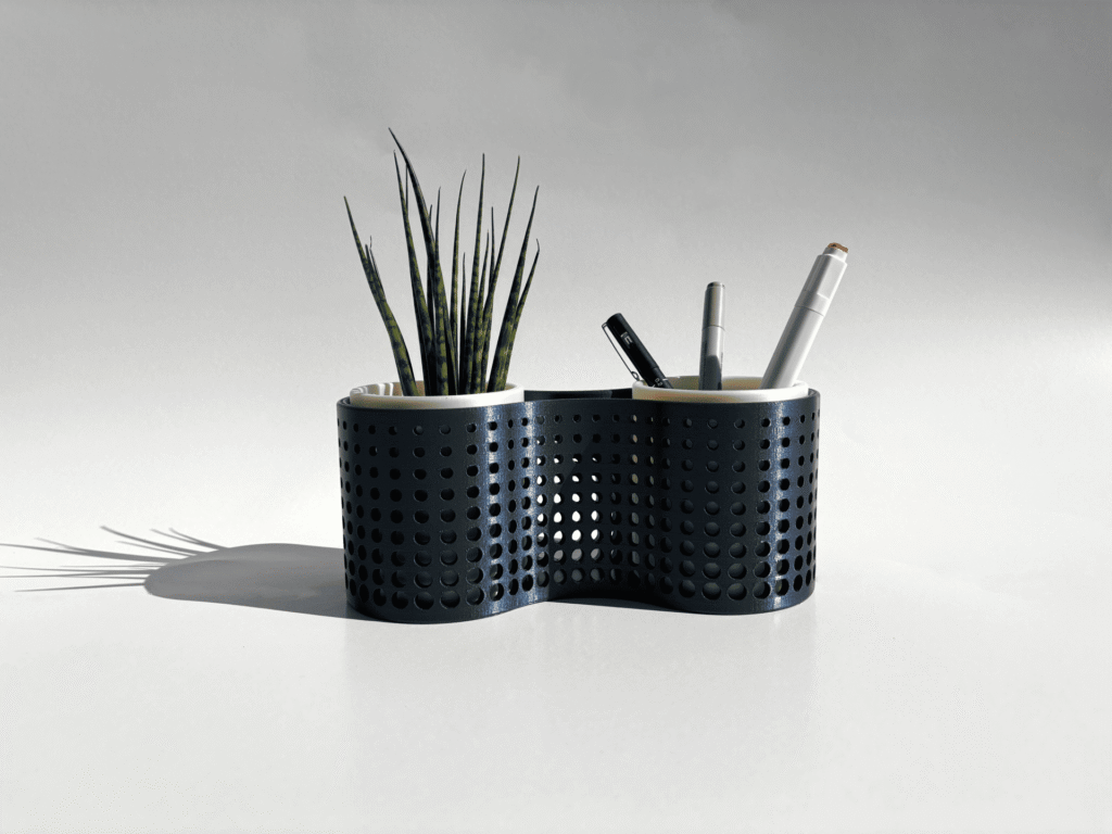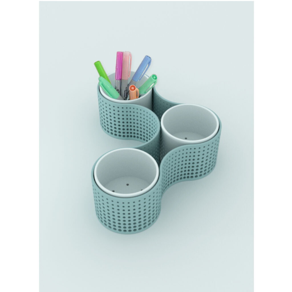 Es un producto compuesto por diferentes módulos cuyos modelos tridimensionales han sido obtenidos a partir de un código de diseño único que permite la obtención de diferentes configuraciones en función de las necesidades del usuario. El código se fundamenta bajo codificaciones binarias de las celdas de una retícula base; se trata de una rejilla de 3×2 en la que se asigna un 0 a las celdas sin lóbulos y un 1 a las que si lo tienen. El código está diseñado para que se generen automáticamente las tangencias entre lóbulos y las perforaciones de las paredes a partir de la configuración binaria inicial. Este producto no solo sirve como organizador de escritorio, también tiene la opción de ser utilizado como macetero o empleado de la forma más útil para el usuario final.