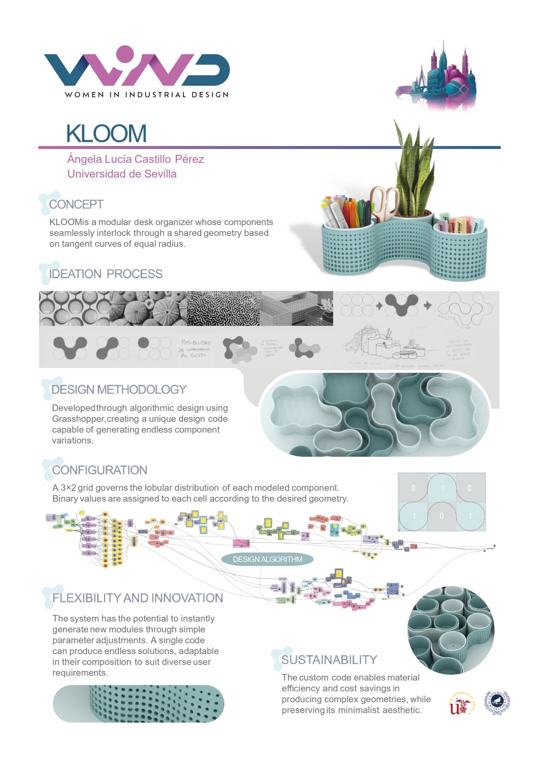 Kloom es un organizador de escritorio modular obtenido a partir de un algoritmo de diseño codificado en el entorno de Grasshopper (plugin de Rhinoceros). Se trata de un diseño cuyos componentes comparten geometrías basadas en tangencias.