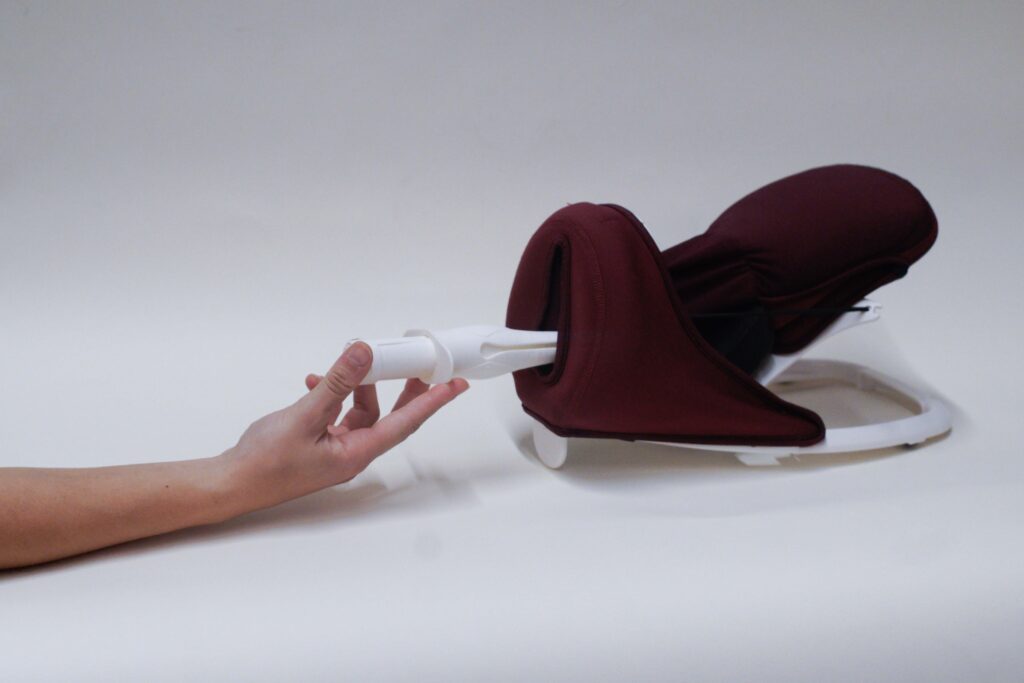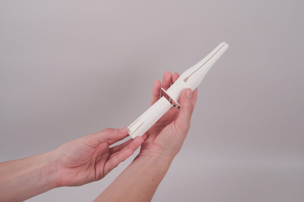 Su mecanismo interno se despliega de forma similar a los pétalos de una flor, utilizando formas familiares y suaves. Esta elección de diseño no es solo estética, busca generar confort psicológico inmediato, eliminando la respuesta de estrés que provoca el instrumental médico convencional.