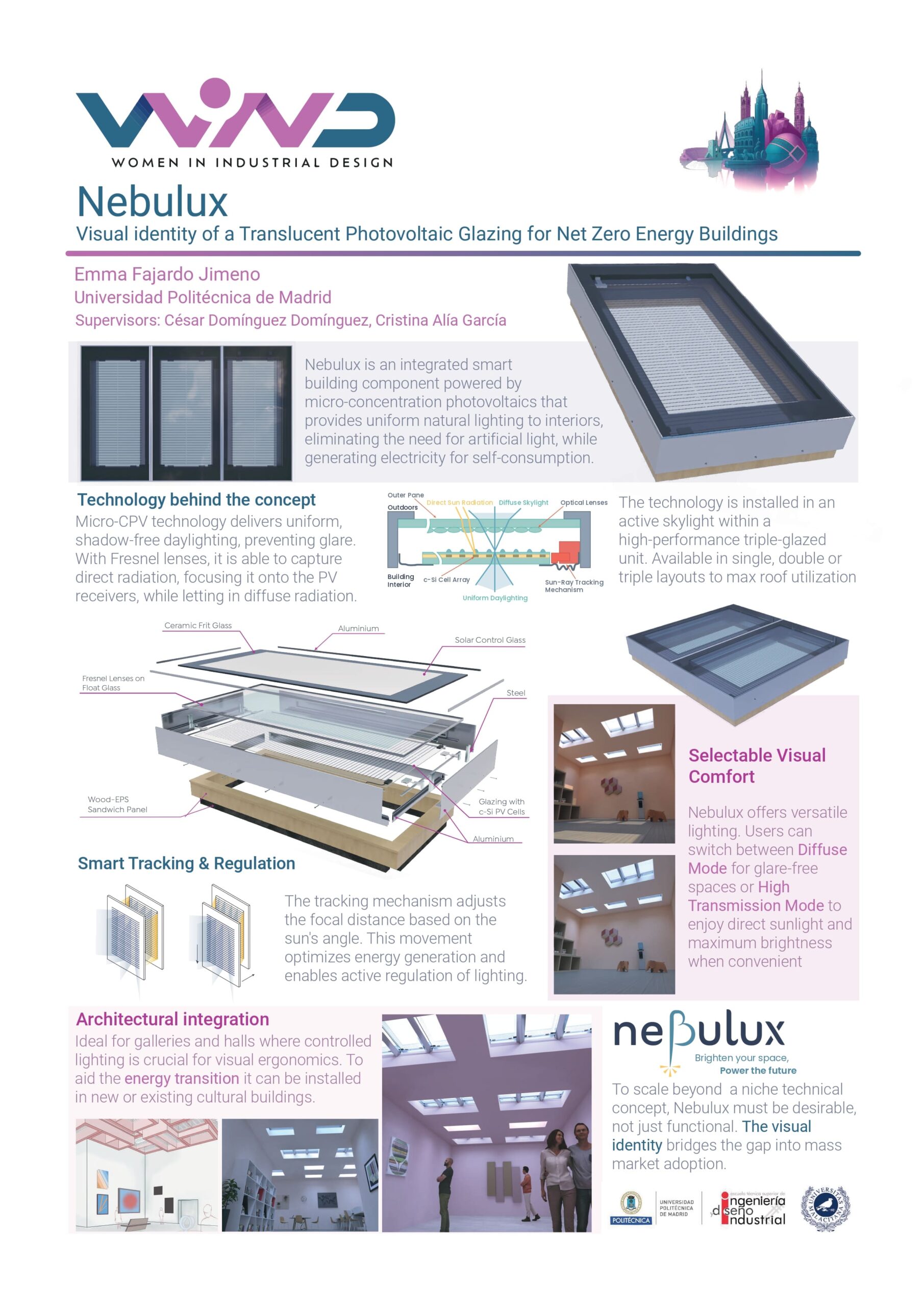 El uso de elementos constructivos que integren células fotovoltaicas es una de las opciones tecnológicas para el desarrollo de edificios con un balance energético nulo que reduzcan la huella de carbono de las ciudades. En este proyecto se considera un nuevo tipo de panel fotovoltaico para integración arquitectónica compuesto por micro ópticas que concentran la luz directa del sol en células fotovoltaicas que generan energía eléctrica, a la vez que se transmite la luz difusa proveniente de la bóveda celeste para generar un ambiente agradable en el interior del edificio y reducir las necesidades de iluminación. Sin embargo, debido a la complejidad tecnológica de la innovación, el valor del sistema puede no estar claro para los usuarios, lo que dificulta su adopción e integración en nuevos proyectos. En este TFG se desarrollará la propuesta de valor del sistema, identificando a los usuarios potenciales y avanzando una identidad gráfica para acercar el sistema a diferentes áreas del mercado de la edificación.