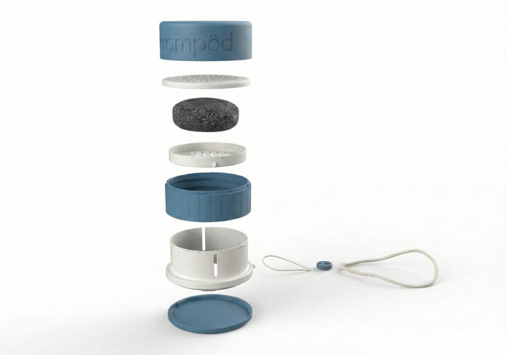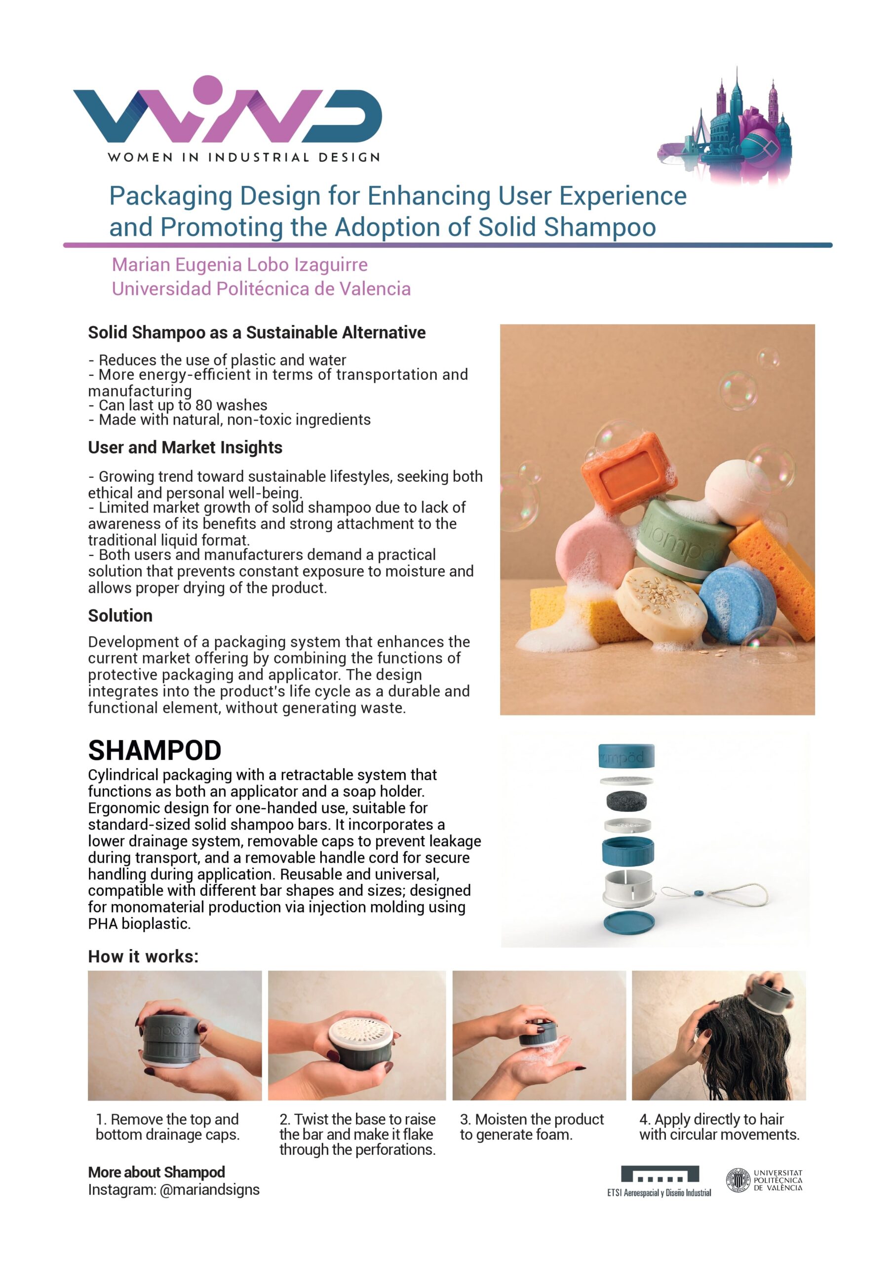 Este proyecto desarrolla un envase reutilizable para champú sólido con el objetivo de mejorar su experiencia de uso y facilitar su adopción como alternativa sostenible al formato líquido tradicional. La propuesta responde a barreras como la falta de conocimiento, la dificultad de almacenamiento y la exposición constante a la humedad, ofreciendo un sistema cilíndrico retráctil que protege la pastilla, permite elevarla mediante un mecanismo giratorio y aplicarla directamente sobre el cabello. El diseño incorpora un sistema de drenaje, tapas desmontables y un cordón para transporte seguro, y está concebido para producción monomaterial en bioplástico PHA. De este modo, el envase no solo protege el producto sino que se integra en su ciclo de vida como un elemento duradero, funcional y alineado con principios de sostenibilidad y reducción de residuos.