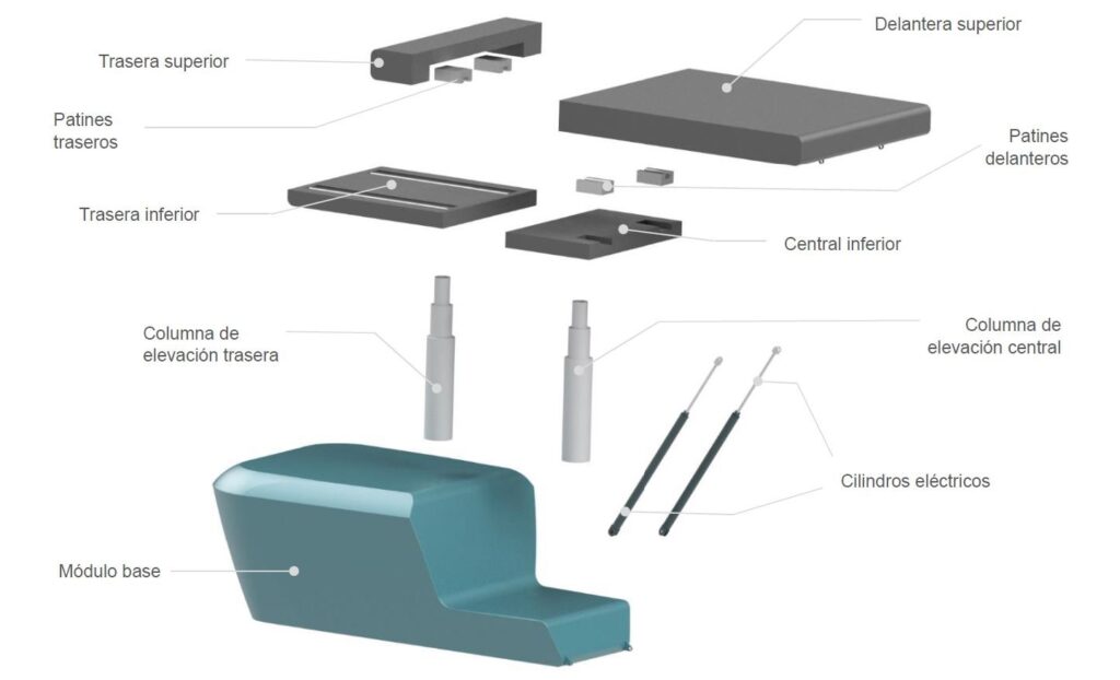La propuesta desarrollada consiste en un asiento modular formado por cuatro piezas, capaces de desplazarse tanto en sentido horizontal como vertical mediante patines, guías de deslizamiento, cilindros eléctricos y columnas de elevación. Este sistema permite una reducción real de la altura mínima del asiento. Su integración requiere un rediseño completo del módulo base, reorganizando el espacio destinado a las baterías.