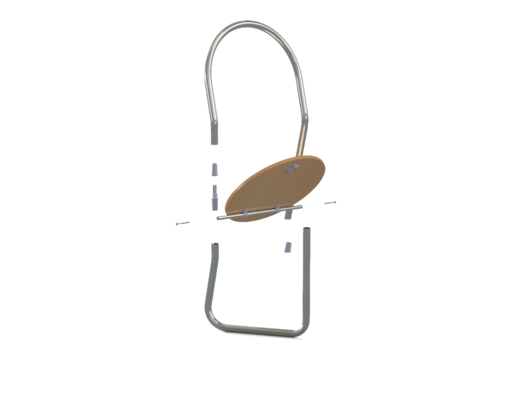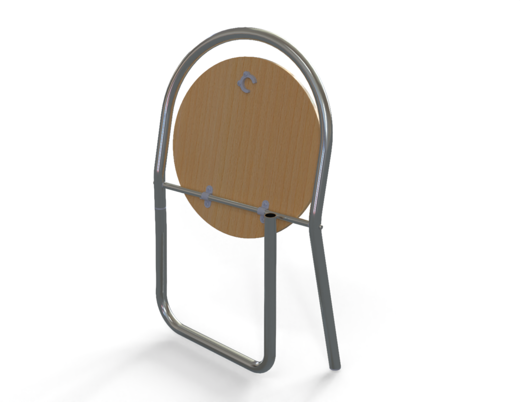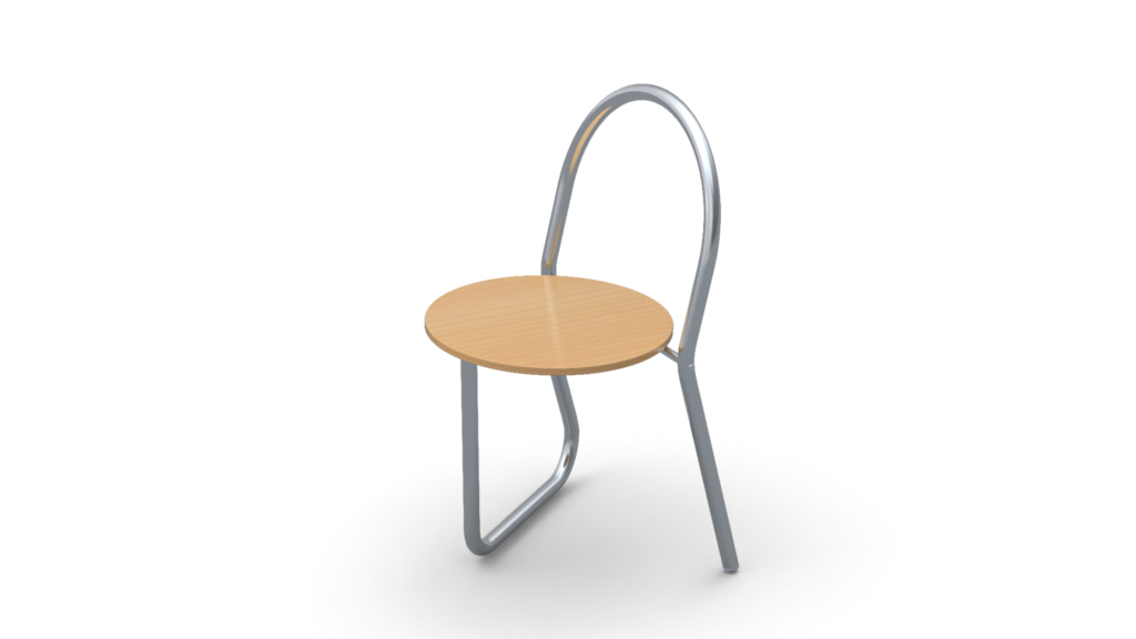 La silla se basa en una estructura de tubo de aluminio, ligera pero robusta, combinada con un asiento de madera de pino que aporta calidez visual y un contraste material atractivo sin comprometer la durabilidad. Los radios de curvatura de la estructura se han definido para ser compatibles con la máquina curvadora de tubos de Alutec, asegurando así un proceso de fabricación viable, repetible y eficiente, sin necesidad de incorporar maquinaria adicional ni operaciones complejas.