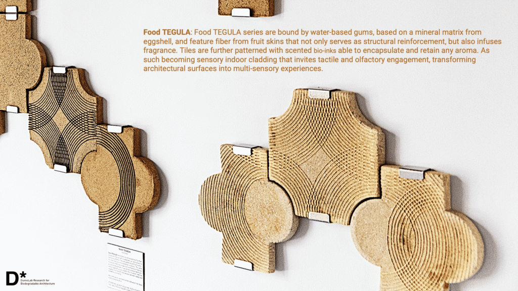 y FoodTEGULA, fabricada con cáscaras de huevo y fibras de frutas, que integra fragancia y experiencia táctil.