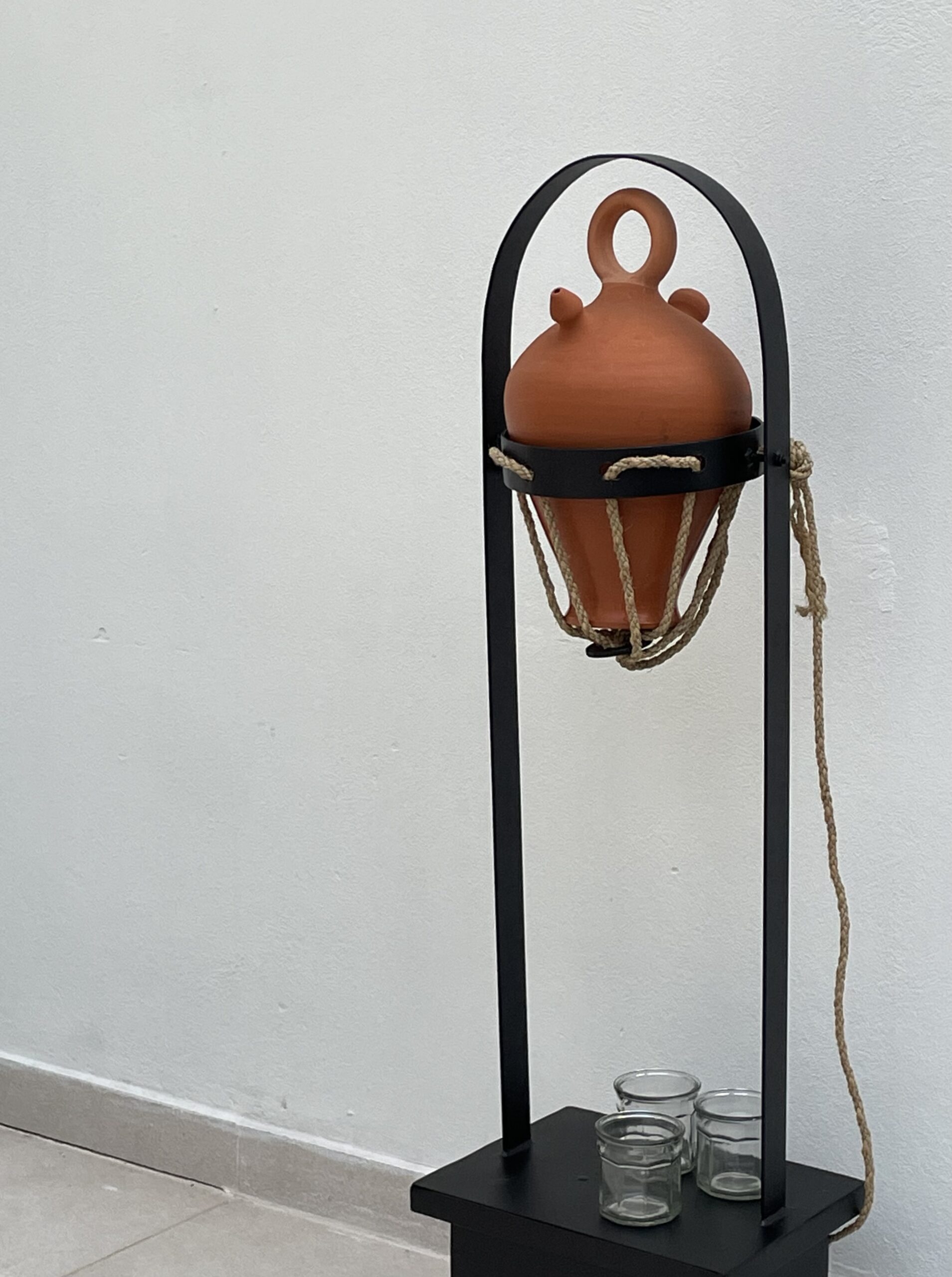 The device is based on a simple yet effective mechanism that facilitates water serving: a stable metal base structure and a pivoting ring that holds the botijo, allowing it to tilt smoothly. Thanks to this system, the user can effortlessly pour water directly into a glass, offering an alternative to the traditional method of drinking “from the spout” directly into the mouth.