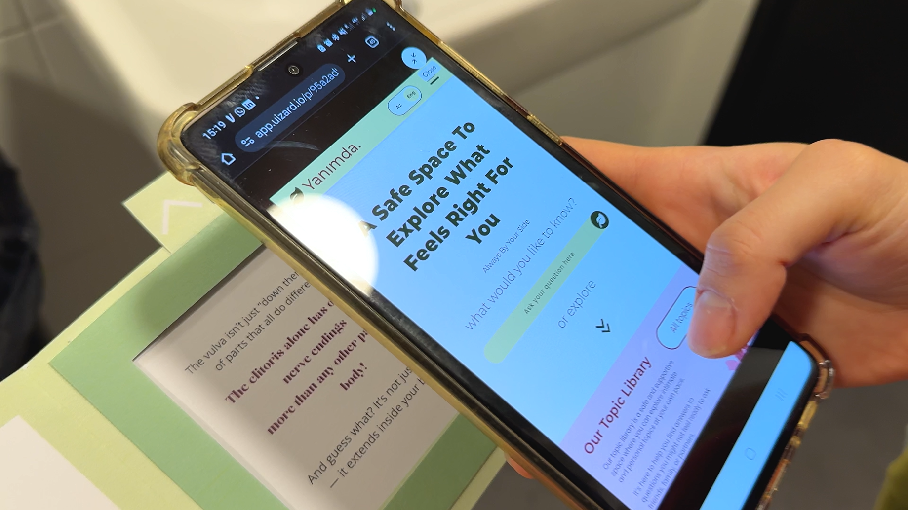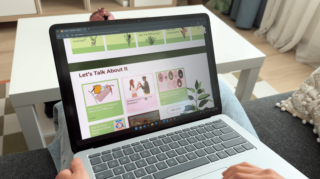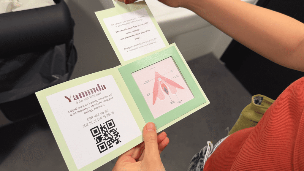 It consists of small cards or leaflets placed in strategic locations, such as public restrooms, containing a QR code for quick and private access. A neutrally designed, welcoming website then functions as a safe space for self-discovery. The information is presented step by step, covering topics from anatomy and menstrual health to relationships, consent, and sexual well-being.